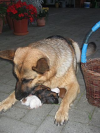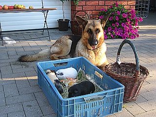 Am liebsten paßt Gitti auf ihre Meerschweinchen auf. Sie trägt sie auch im Körbchen umher. Warum sie das macht , wissen wir nicht genau, früher hatten wir Kaninchen, die mußten wir abschaffen und ein Meerschwein blieb übrig, das hat Gitti dann wohl adoptiert. Und so bekommen wir immer mal eins dazu, oder wir verschenken welche wenn sie zuviel werden.