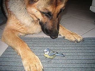 Hat nun die Meise Angst oder der Hund, sieht jedenfalls nicht so aus .