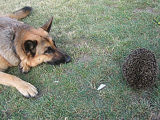 Hier paßt Gitti auf eine Igel auf, der war über Nacht in den Teich gefallen und total erschöpft, als wir ihn daraus geholt hatten.